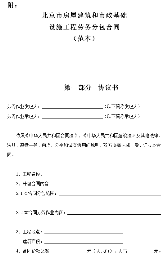 京建市〔2009〕《北京市房屋建筑和市政基础设施工程劳务分包合同管理暂行办法》第二条: 本办法所称劳务分包合同是指劳务作业发包人将其所承包的房屋建筑和市政基础设施工程中的劳务作业发包给劳务作业承包人,由劳务作业承包人按约定完成劳务作业内容而签订的协议。